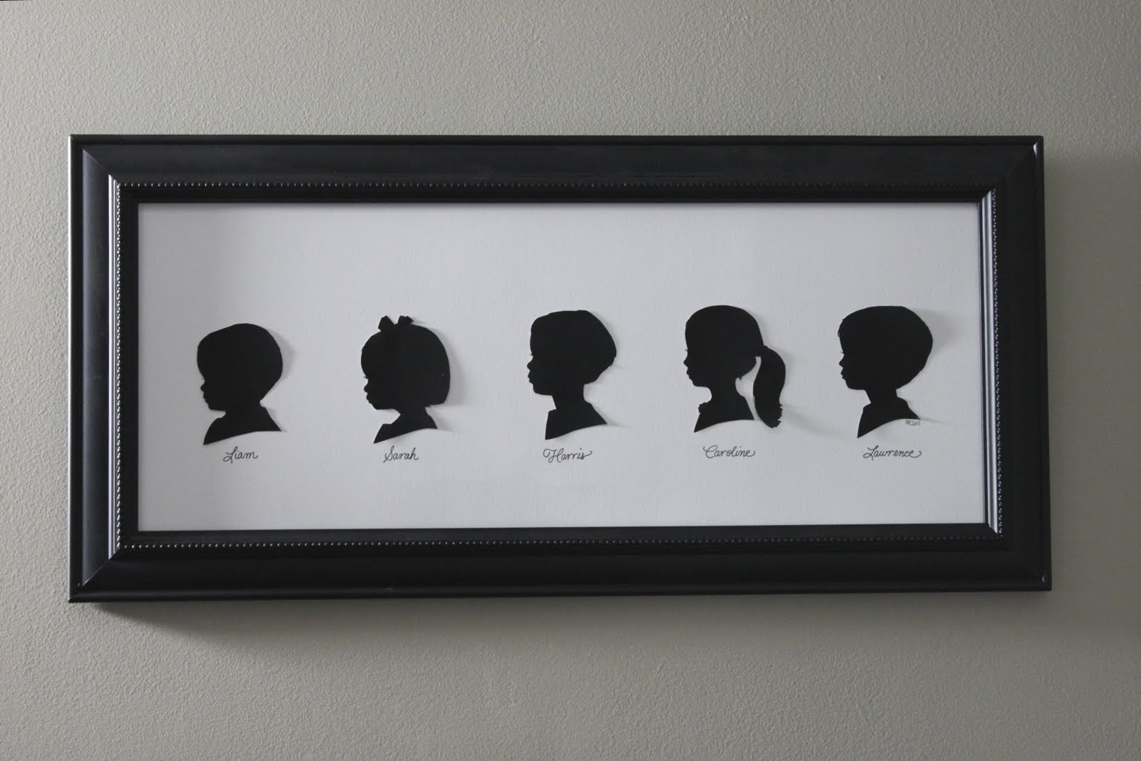 This is a good idea for a large family – or for grandchildren. You don’t have to frame them individually. In this example, I used a standard wide format frame from a craft store, cut an art bristol white board to fit, then placed each silhouette in a row with the names handwritten below. I love a row of black oval frames with childrens’ silhouettes lining a wall, but when wall space is limited, this is a nice option. I like how this turned out. Thank you, Myers family.